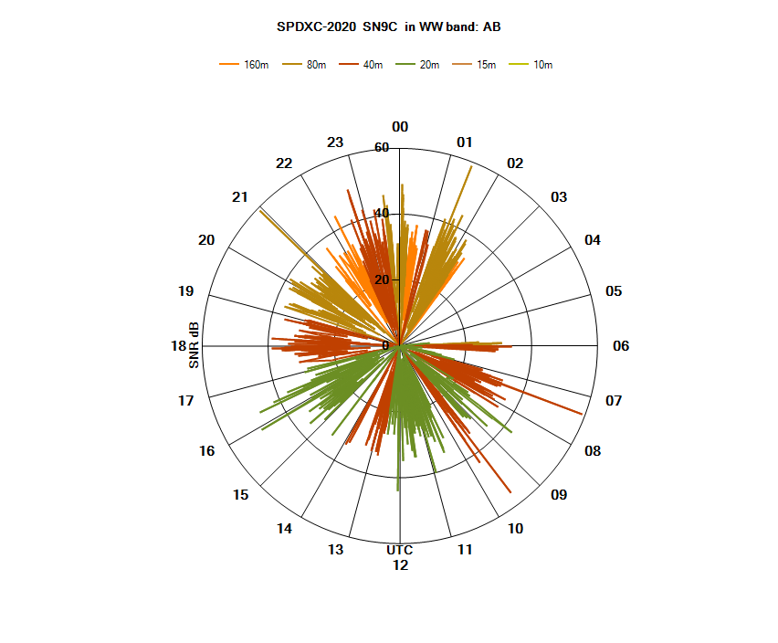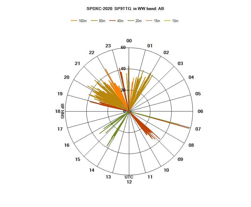 Wykresy kołowe biegunowe słyszalności z Częstochowy podczas SPDXC-2020
